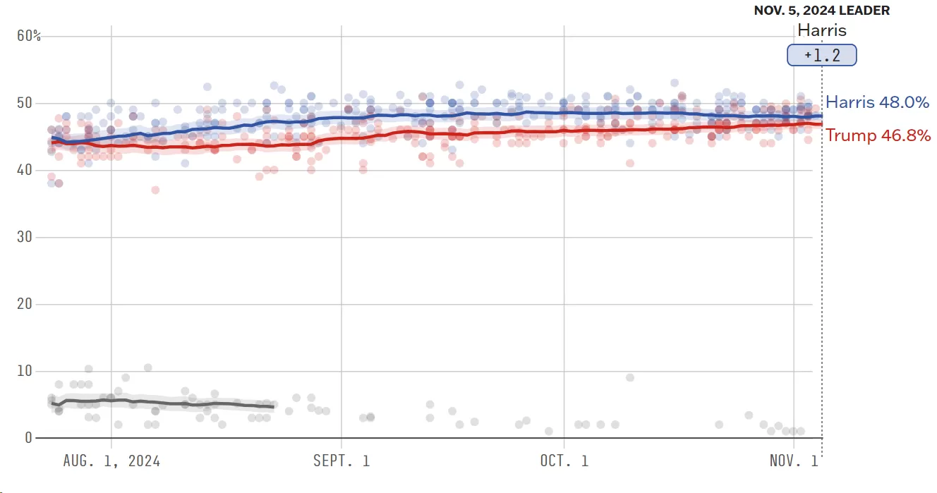 The national polls have tightened again in the last few days. In our previous analysis last week we had Harris ahead by 1.4 points nationally, whereas now