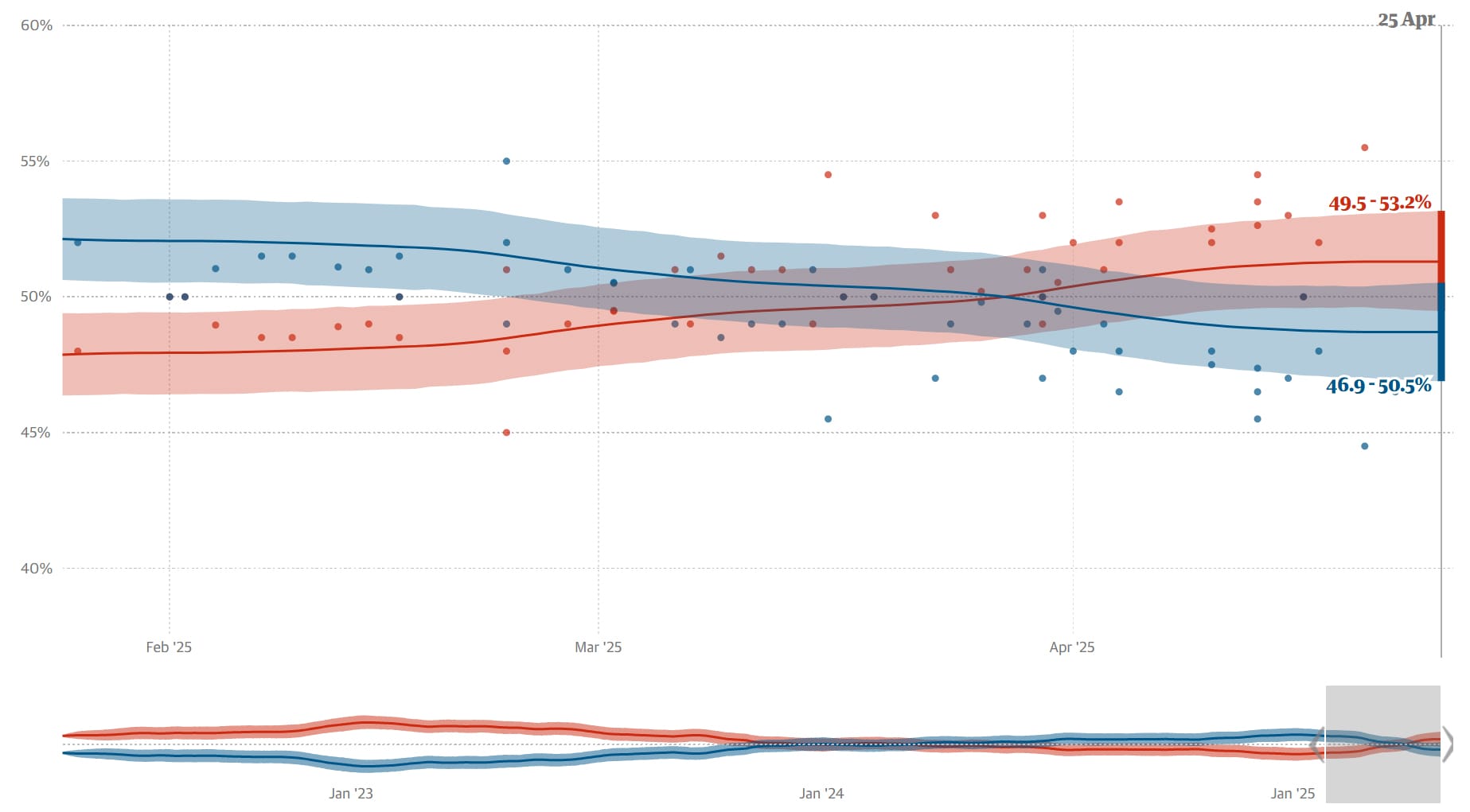 - Newspoll (21–24 April) places Labor ahead 52–48 per cent after preferences. Primary votes are effectively level—34 per cent Labor, 35 per cent Coalition—while Peter Dutton’s net satisfaction falls to –24 and Anthony Albanese holds –9 with a sixteen-point advantage as preferred prime minister.