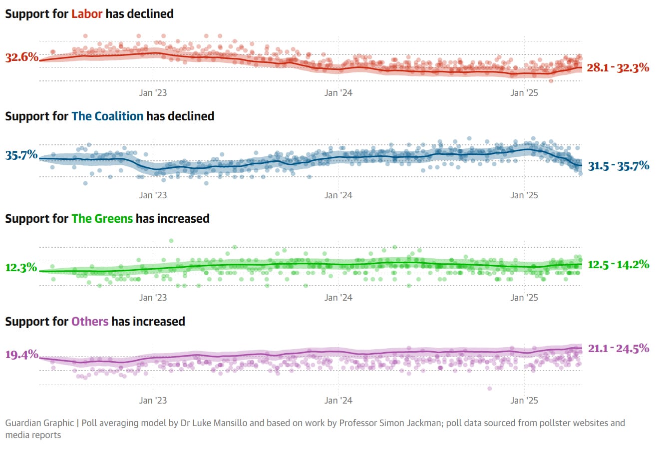 These latest polls – conducted before last night’s final debate – suggest Labor has consolidated its roughly four point lead on a two-party-preferred basis. This is narrower than at the same stage of the 2022 campaign, however it is accompanied by a Coalition primary vote approaching record lows.Both major parties appear to be haemorrhaging support to the smaller parties, all of which have increased their share of the primary vote in recent weeks, according to The Guardian’s analysis: