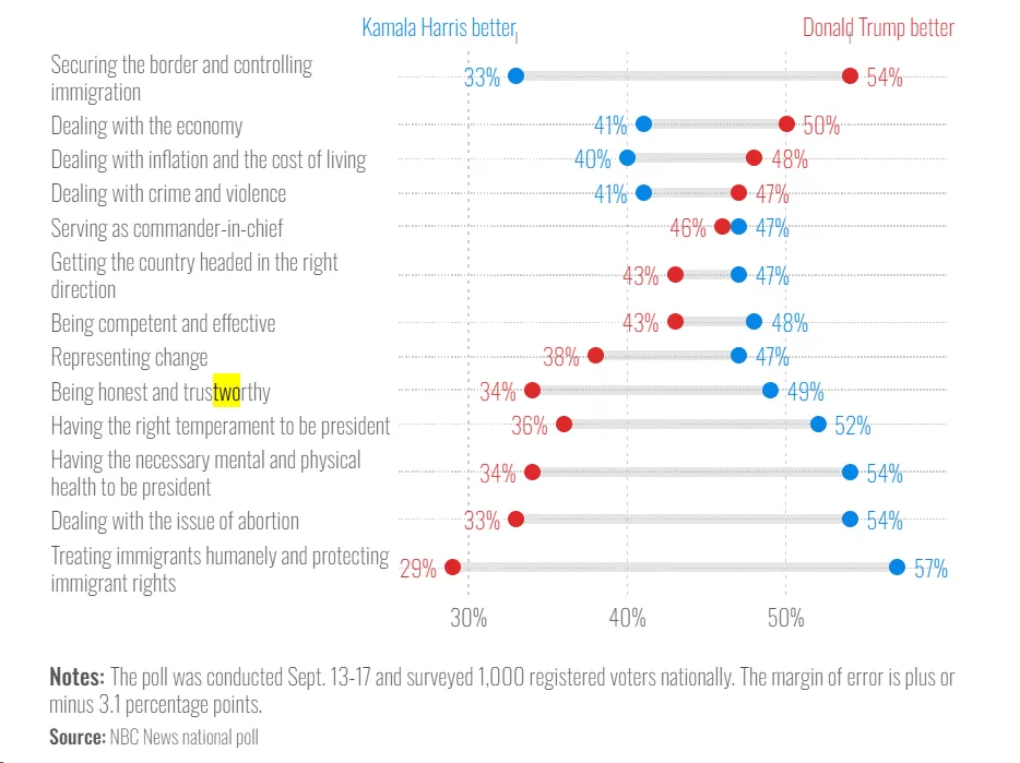 21-point advantage over Trump on abortion rights.Other issues: Foreign policy concerns, including conflicts in the Middle East and support for Ukraine, are influencing voter decisions. Climate change is an area where Harris has an advantage, especially among younger voters. Healthcare is also a top priority for Harris voters, with 40% considering it one of the most critical issues.It’s worth noting that the importance of these issues can vary among different voter groups. For example, while the economy is the top issue overall, abortion is front and centre for Harris voters (55%), and immigration is a crucial concern for Trump voters (57%).An NBC poll conducted in September also examined what issues voters of all stripes believed were the strengths and weaknesses of both candidates. The results show that Trump has a commanding lead on border security, the economy, the cost of living, and crime. Harris leads on abortion, competency and having the right temperament to be president.