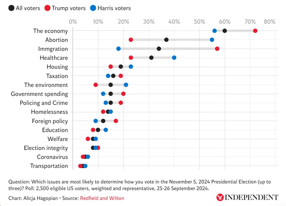 Redfield & Wilton Strategies poll of 2,500 US adults conducted up to September 26, 2024, the economy is the most important issue impacting how people will vote in this election. Trump is generally seen as more capable of handling economic challenges, with a 9-point lead on economic matters and an 8-point lead on managing the cost of living