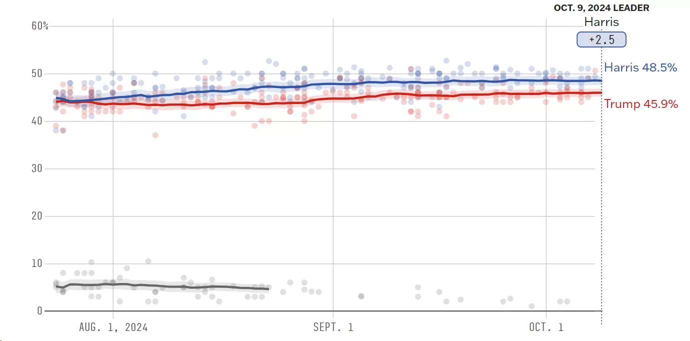 Harris with a 2.6-point lead (48.5% to 45.9%).